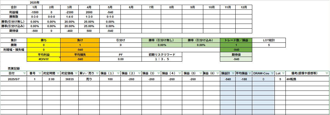 トレード日記|2025年5月7日 日経225 4H転換狙いでギャップダウン被弾