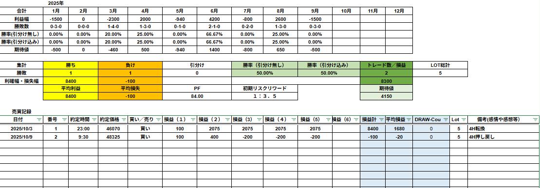 トレード日記|2025年10月9日 日経225 4H押し戻し狙いでちょい負け