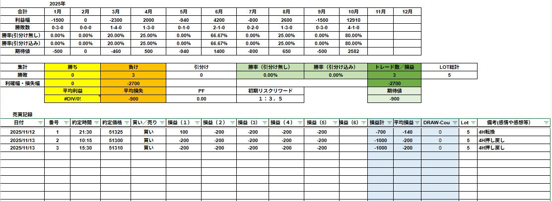 トレード日記|2025年11月13日 日経225 4H押し戻し狙いで3連敗